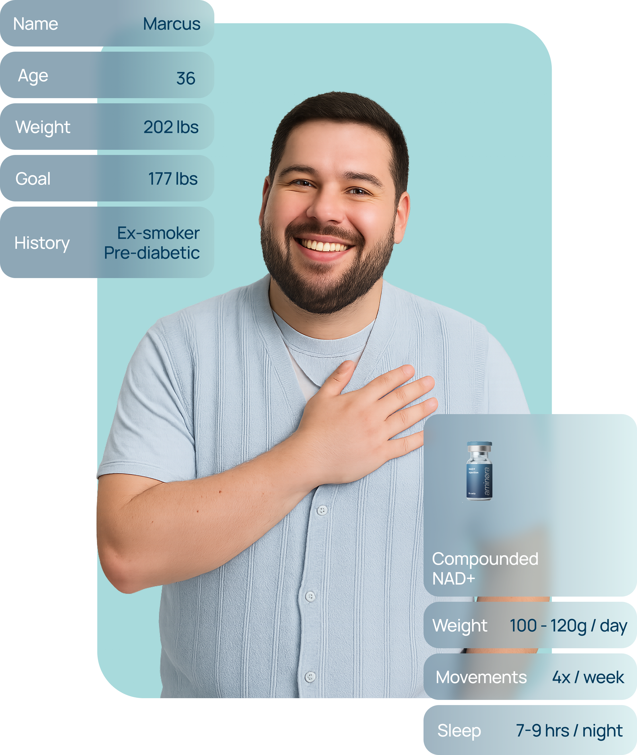 "The tirzepatide + B12 shots give me steady energy all week. No crashes, no jitters. I can finally keep up with work and the gym.""I was nervous to start GLP-1, but the Aminora team made everything simple. Lost 14 lbs in 2 months and actually feel like myself again."